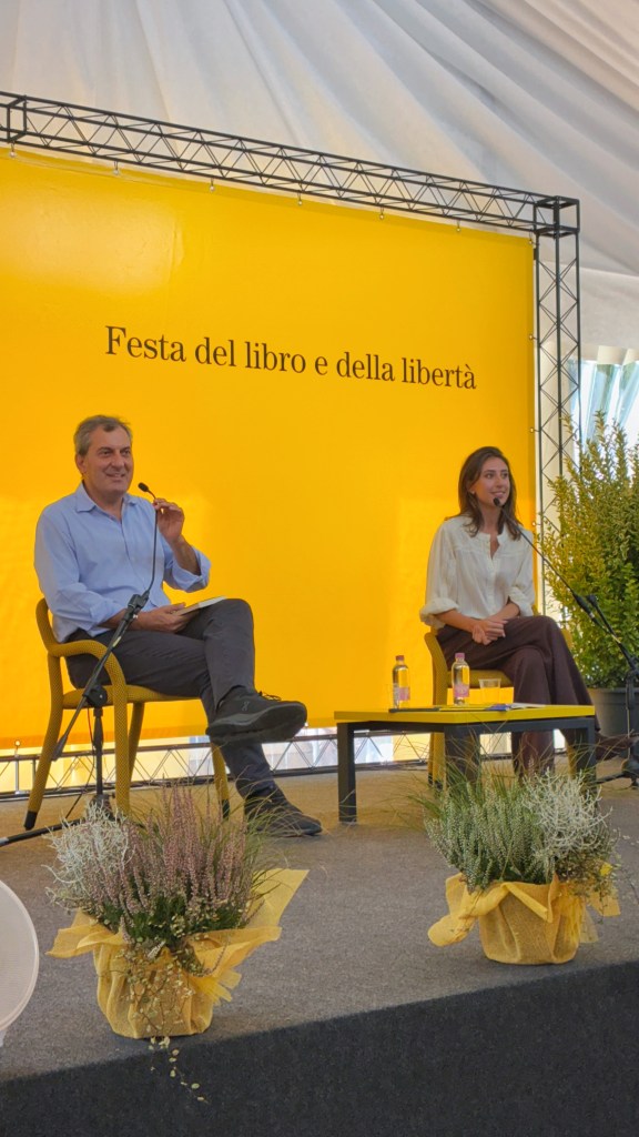 The first talk I attended was Cecilia Sala in conversation with Mario Calabresi, two great journalists who talked mostly about Cecilia’s new book, I figli dell’odio, which investigates the rise of radicalisation among young people focusing especially on Israel, Palestine and Iran. I love her work and almost religiously follow her daily podcast Stories, never missing an episode (which, let’s be real, doesn’t happen for any other podcast I follow). So, you can imagine my excitement at being able to listen to this conversation live! The event was incredibly well attended, and hundreds of people remained standing outside the hall to try to listen as seats had all been filled up. If you’re curious about her work, Cecilia’s first book, The Fire, has been translated into English and published by Europa Editions.