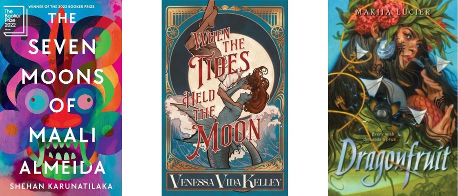 The Seven Moons is my physical read, When the Tides is my digital, and I am very close to finishing Dragonfruit on audio.